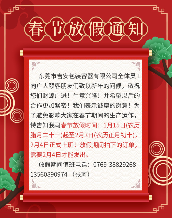 新春復(fù)始,萬象更新!非常感謝各位新老客戶長期以來對吉安容器的鼎力支持與關(guān)照,在新春來臨之際,東莞市吉安包裝容器有限公司全體員工向廣大顧客朋友們致以新年的問候,敬祝您們財源廣進(jìn)!生意興??!并希望以后的合作更加緊密!我們表示誠摯的謝意!