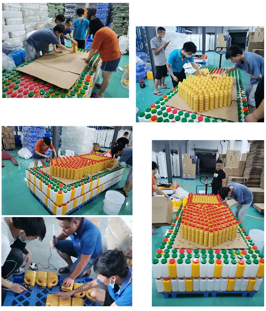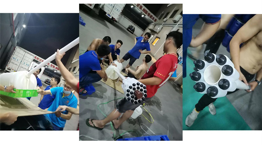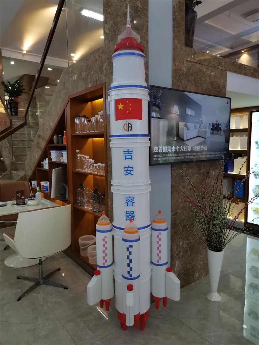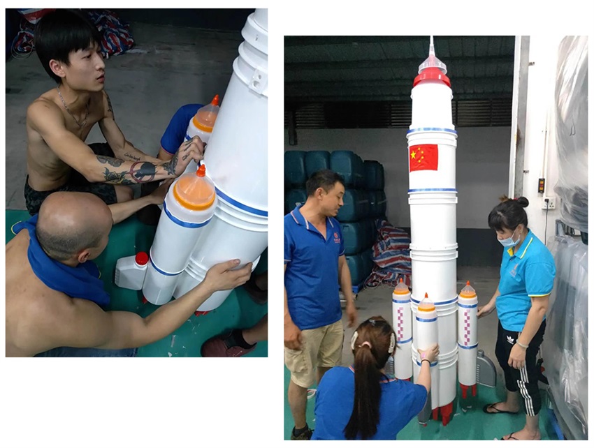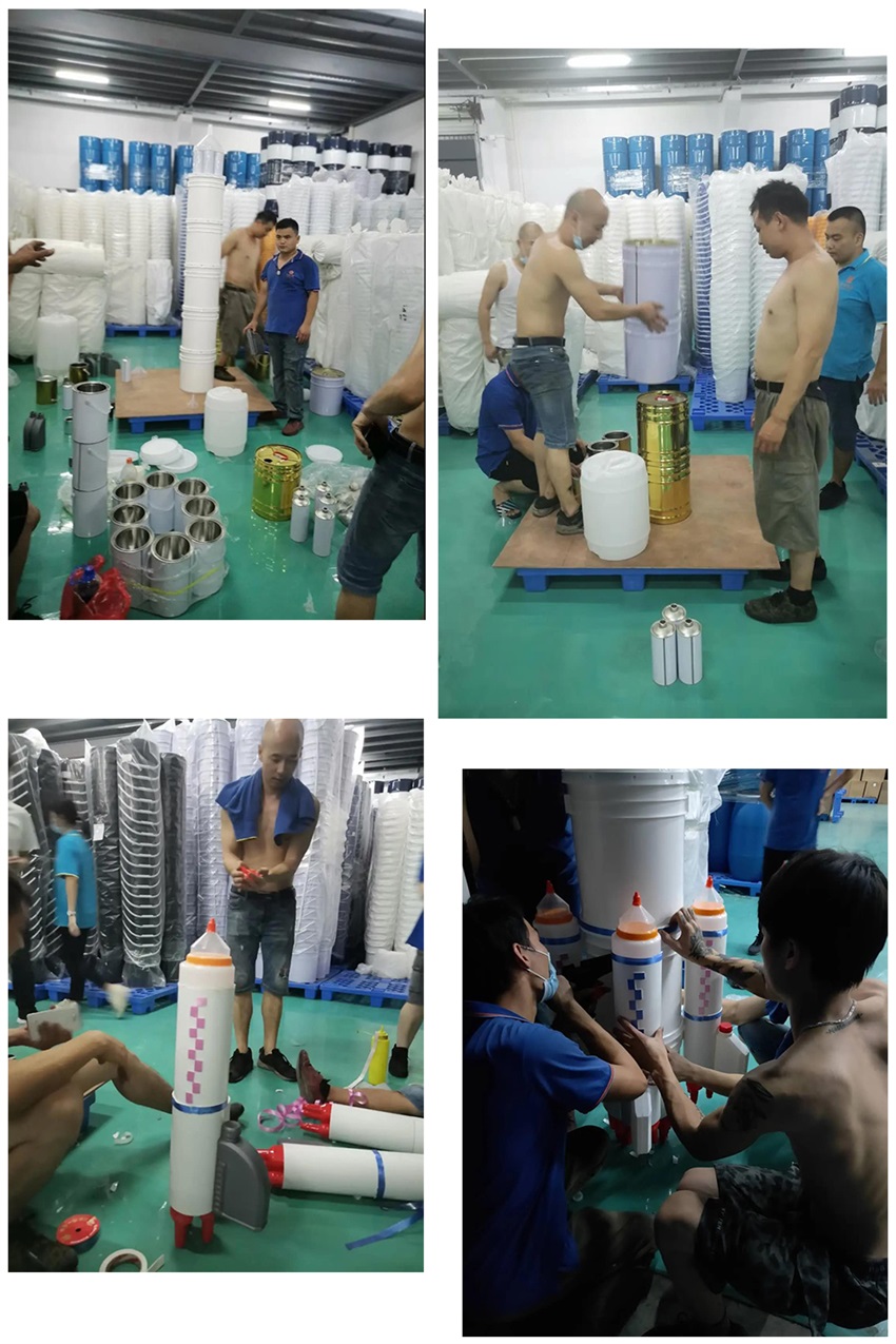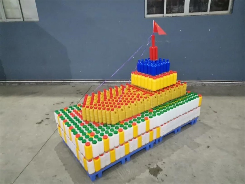 該隊模型作品”一波三折”,前期討論了多種方案,最終借鑒超市堆碼花式陳列的方式,確定做輪船,用方瓶,圓瓶、機油瓶系列進行輪船的設(shè)計,該作品象征吉安容器未來將繼續(xù)乘風(fēng)破浪,披荊斬棘,勇往直前,揚帆遠航。