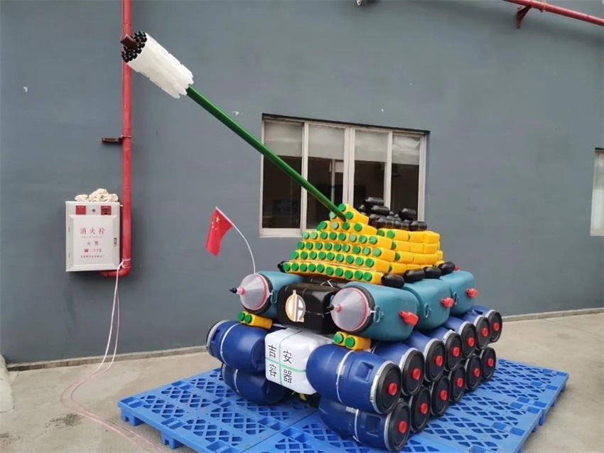 用鐵箍桶組成的坦克,搭配方瓶蓋作為點綴,1L方瓶作為主體,大炮用指甲油瓶拼接而成,方罐、漏斗、圓瓶等采用多系列產(chǎn)品進行混搭,居然視覺上毫無違和感,整體效果棒棒噠!