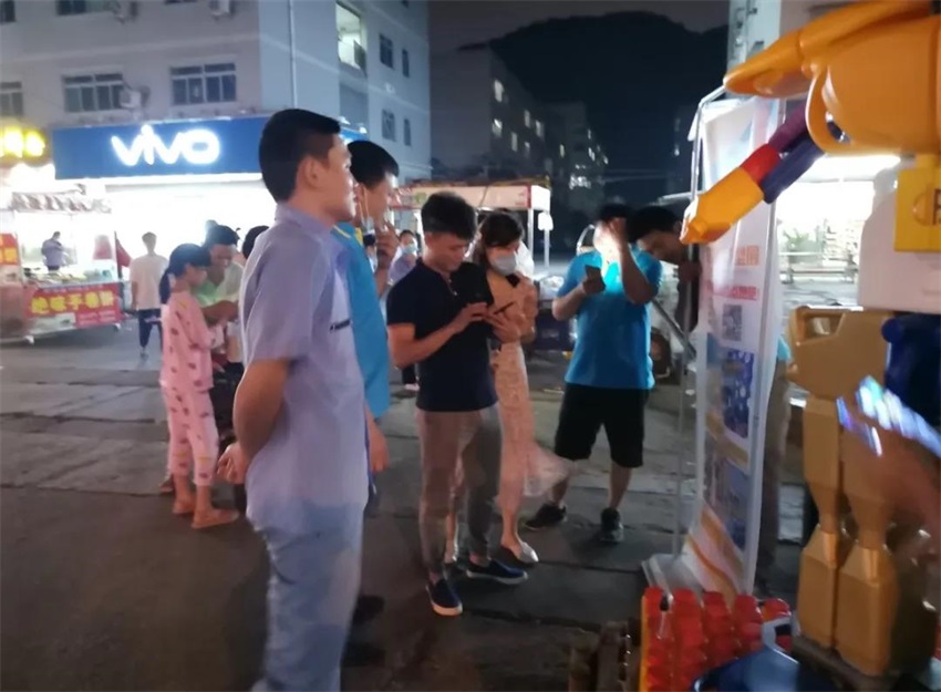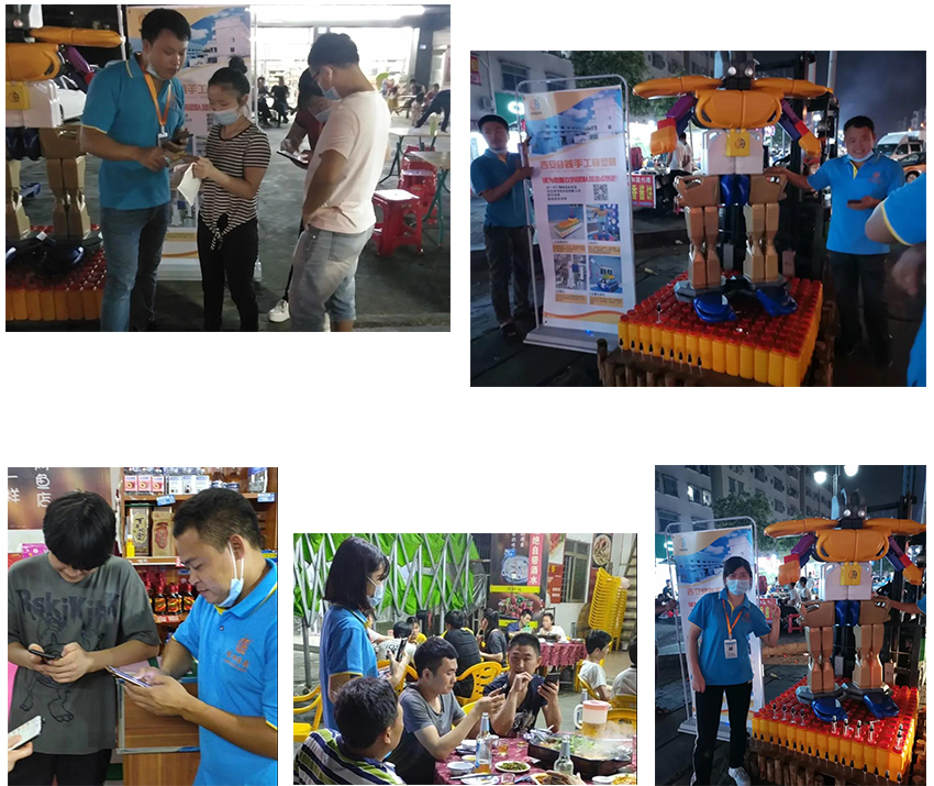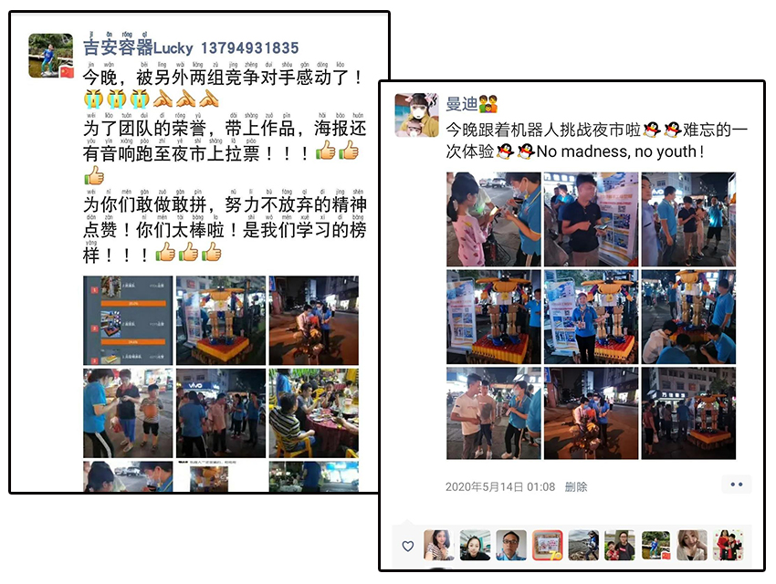 票數(shù)你追我趕,排行榜第一位輪流做,這時候是提現(xiàn)人脈和拉票技巧的時候啦!朋友圈也給“吉安大軍”包圍,很快我們也包圍了各自的微信群,各隊差距變得越來越不明顯,在雙方展開激烈的線上廝殺之時,越前隊率先出大招,夜市拉票!他們決定把他們的作品機器人搬出夜市,勇敢的向別人展示他們的作品,進行線下拉票。