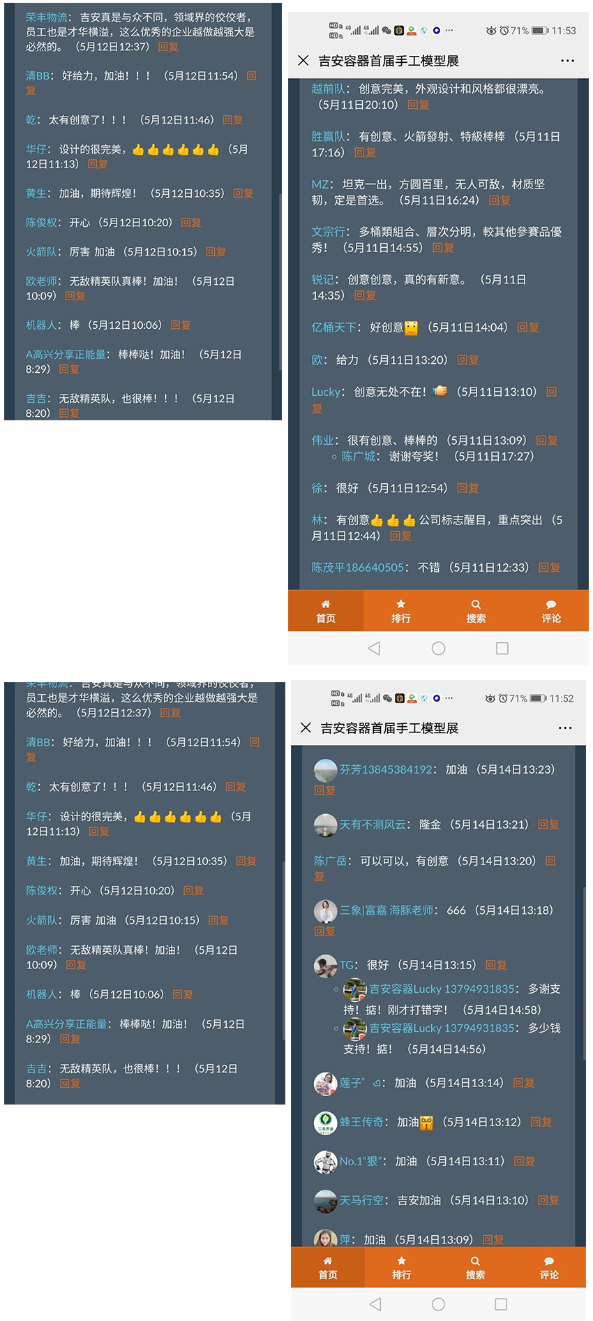 首屆創(chuàng)意手工模型大賽圓滿落下帷幕,感謝每一位支持我們的朋友們,正是因為有了您們的支持和鼓勵,使得我們整個團隊更加充滿信心,我們將繼續(xù)發(fā)揮創(chuàng)新、專研、拼搏的精神,本次活動帶給我們的刺激、興奮、驚險、也更深刻的體會到擔(dān)當(dāng)、分工、合作、協(xié)助、理解的重要性。我們的拉票行為可能會給大家?guī)砝_,給您們添麻煩了!活動的成功離不開每一位客戶朋友們對本次活動的包容及大力支持!再次感謝!我們將繼續(xù)發(fā)揚“吉安精神”,為客戶提供更高價值,為團隊奉獻更大力量!