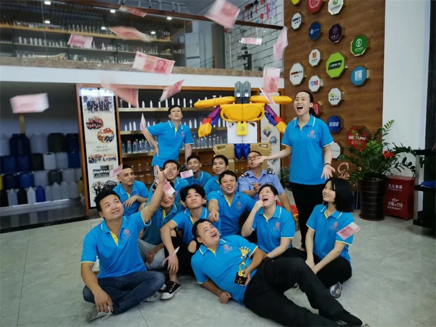 在試用了鐵罐、灰色機油瓶、膠水瓶等產(chǎn)品均不理想之后,最終敲定采用純色風(fēng)格產(chǎn)品元素搭配藍色邊框設(shè)計,發(fā)射中的火箭寓意我們團隊業(yè)績一飛沖天,直沖云霄!