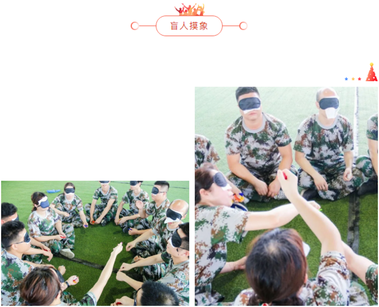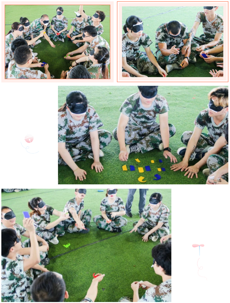 四組成員各自蒙住眼睛,每組團(tuán)隊(duì)都會拿到34張6種顏色和6種形狀的卡片,其會有2種顏色各自缺少一個(gè)形狀的色板,每名成員將從教練手中領(lǐng)到2—3塊色板,團(tuán)隊(duì)成員只能詢問教練拿到的版的顏色,團(tuán)隊(duì)成員需要通過有效的溝通,合作,分析來判斷缺少的是那種顏色,哪個(gè)形狀算完成團(tuán)隊(duì)任務(wù),以計(jì)時(shí)的方式得出勝負(fù)。