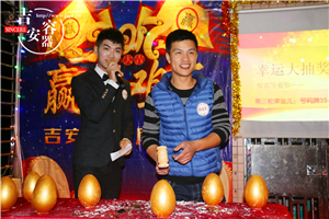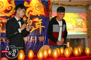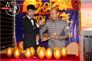 我們的重頭戲現(xiàn)在就來啦!今年抽獎(jiǎng)環(huán)節(jié)和以往不同,從抽獎(jiǎng)改為砸幸運(yùn)金蛋,每個(gè)金蛋里面都有一個(gè)代表意頭的字條,字條的意思代表了不同金額的紅包,不管多少都代表了公司對(duì)每個(gè)人新的一年的美好祝愿,那么,新的一年里你希望得到怎樣的祝福呢?那就拿起你手中的錘子,砸下去。