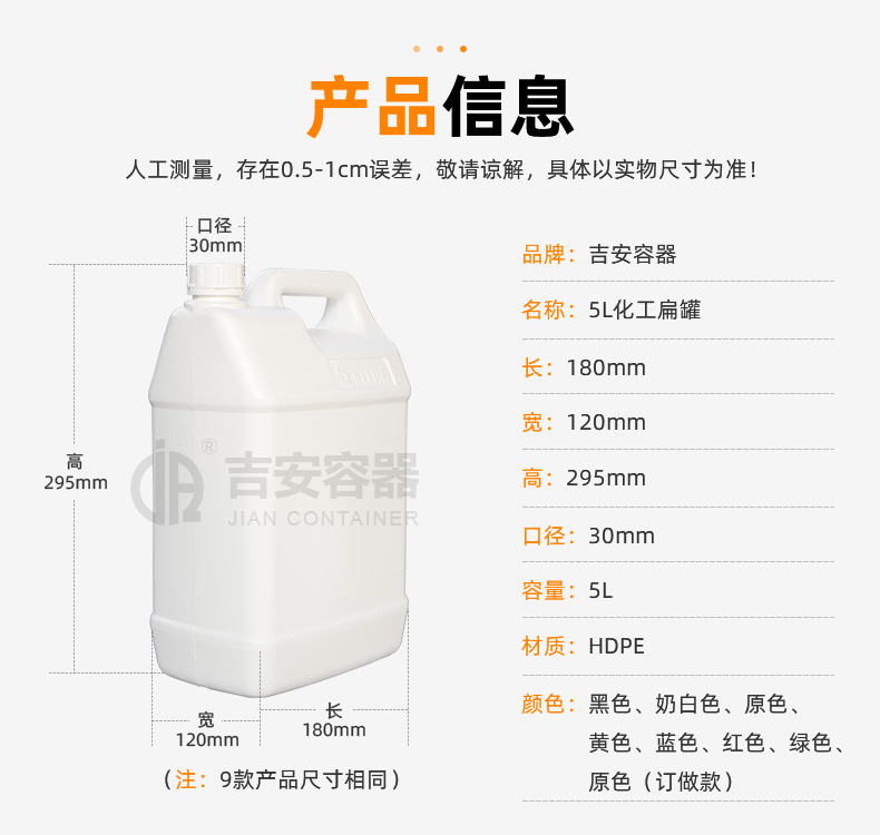 塑料扁罐采用HDPE原材料吹塑而成,具有良好的耐酸堿性及密封性,方形設(shè)計(jì)方便堆放,不占用空間,美觀實(shí)用。具備不變形,使用方便等特征,可根據(jù)客戶需求做印刷及貼膜,產(chǎn)品適用于尿素、機(jī)油、汽油、清洗劑、化工助劑、食品添加劑等液體包裝。