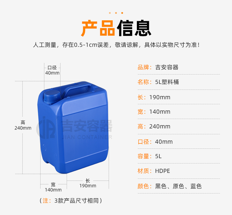 小口塑料桶:采用全新聚乙烯原料吹塑工藝制作而成,具有耐腐蝕,耐酸堿特性,小口設計密封性能強,廣泛應用于化工、清潔、食品、添加劑、汽車等各行業(yè)液體包裝。