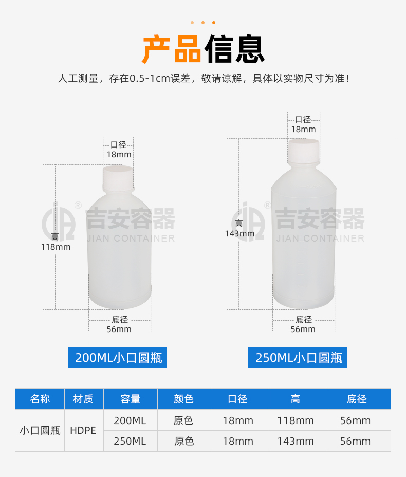 小口塑料瓶采用全新HDPE塑膠原料吹塑而成,具備韌性好、耐酸堿、耐腐蝕、不變形,密封性能佳等特點(diǎn),可根據(jù)客戶(hù)需求定制、改色、產(chǎn)品適用于化工、清洗劑、醫(yī)藥、液體、食品、農(nóng)業(yè)等各行業(yè)包裝。