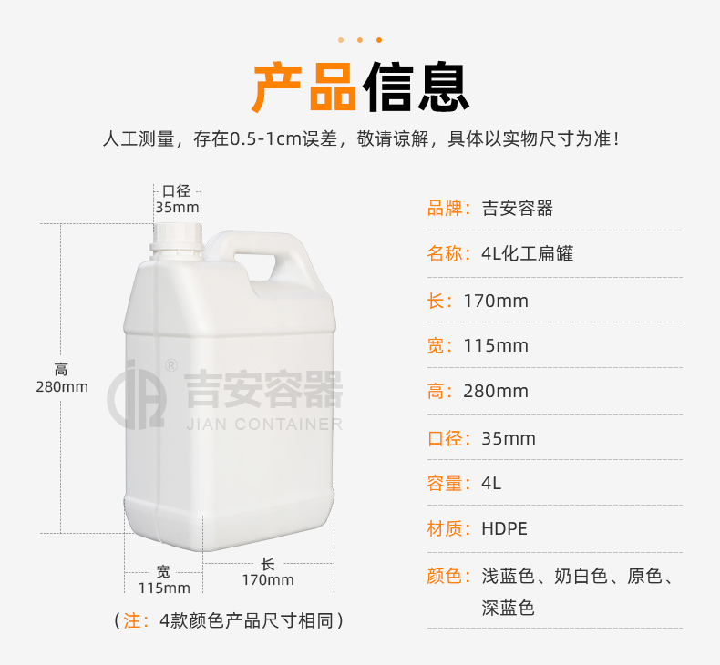 塑料扁罐采用HDPE原材料吹塑而成,具有良好的耐酸堿性及密封性,方形設(shè)計(jì)方便堆放,不占用空間,美觀實(shí)用。具備不變形,使用方便等特征,可根據(jù)客戶需求做印刷及貼膜,產(chǎn)品適用于尿素、機(jī)油、汽油、清洗劑、化工助劑、食品添加劑等液體包裝。