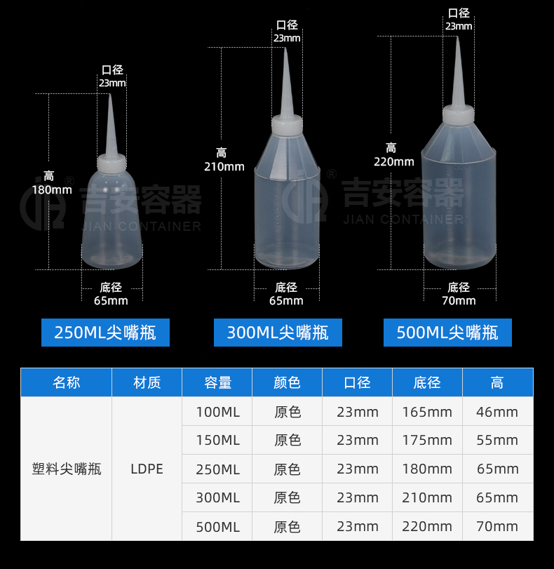 東莞市吉安包裝容器有限公司創(chuàng)立于2000年8月1日,是中國知名品牌企業(yè)。已通過ISO 9001質(zhì)量管理體系資質(zhì)認證,加入了中國中空協(xié)會,并獲得《中國知名品牌》,《國家標準合格產(chǎn)品》,《全國重合同守信用AAA級企業(yè)》,《質(zhì)量.服務(wù).誠信AAA企業(yè)》等榮譽稱號。根據(jù)材質(zhì)的不同,我們的產(chǎn)品分為塑料容器、鐵質(zhì)容器、鋁材容器、玻璃容器、紙質(zhì)容器等五大類。按產(chǎn)品的名稱分為塑料桶、塑料瓶、包裝桶、涂料桶、機油桶、油脂桶、化工罐、膠水瓶、鐵桶、鐵罐、鋁瓶、鋁罐、阻隔瓶、高阻隔瓶等,容量從3ML至1000L多種規(guī)格,多種款式。適合包裝的產(chǎn)品包括:化學(xué)試劑、化工原料、化工助劑、飼料添加劑、油墨、油漆、樹脂農(nóng)藥、日用化學(xué)品、聚氨脂、膠粘劑,廣泛應(yīng)用于化工、建筑、食品、醫(yī)療、生物等各領(lǐng)域。