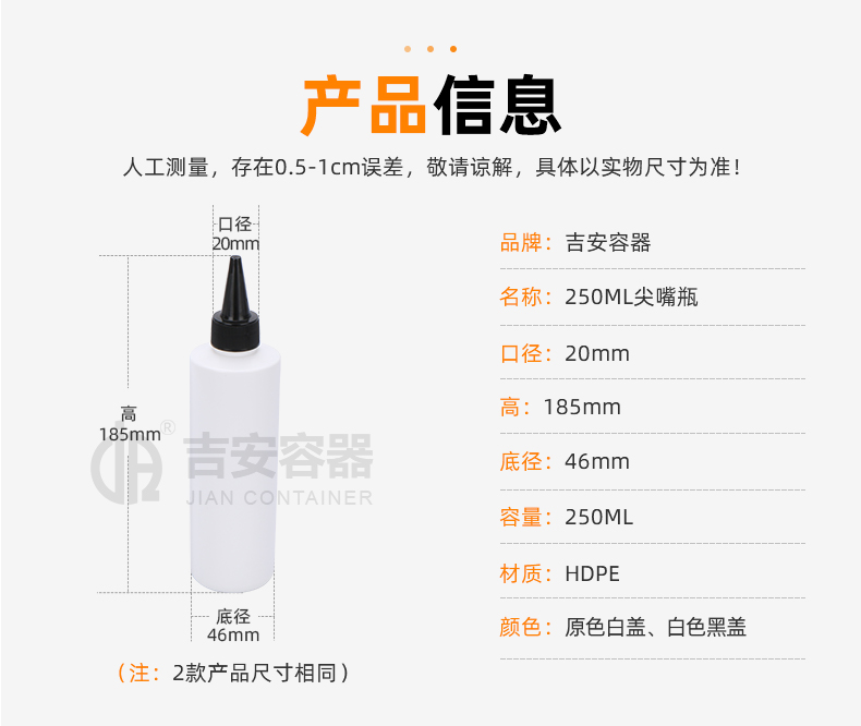 尖嘴瓶適用行業(yè)廣泛,多用于膠水包裝、眼藥水包裝、食品調(diào)料包裝,因其尖嘴特點(diǎn),具備方便滴膠,操作時(shí)流量可控可調(diào),使用方便。
