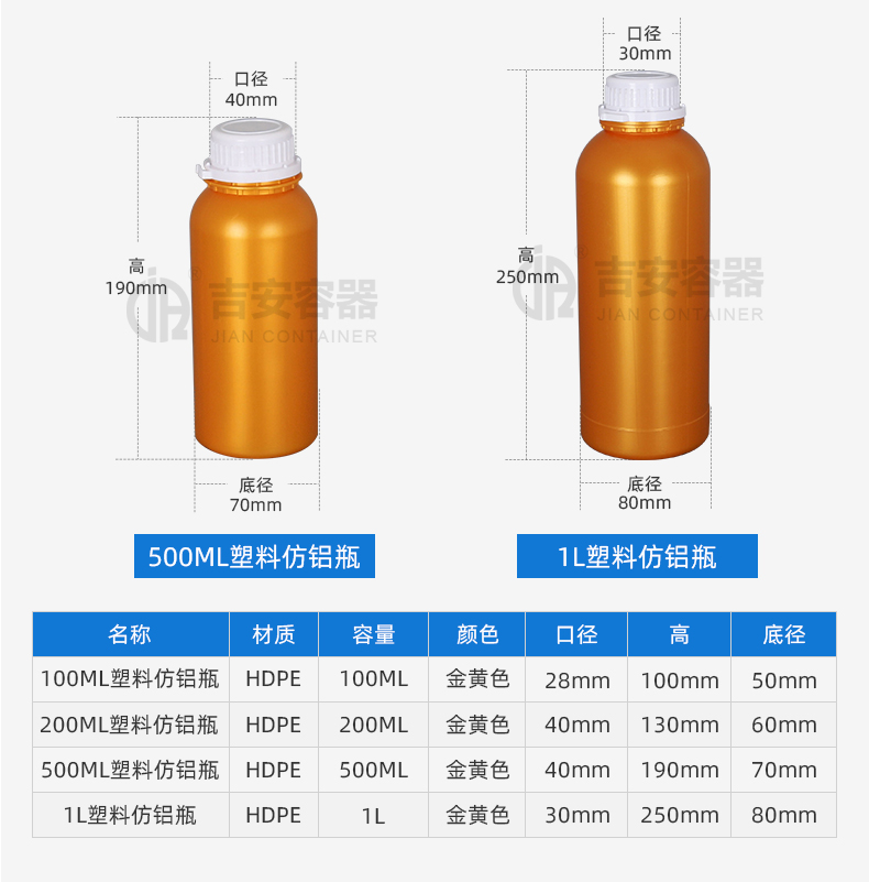 東莞市吉安包裝容器有限公司創(chuàng)立于2000年8月1日,是中國知名品牌企業(yè)。已通過ISO 9001質(zhì)量管理體系資質(zhì)認證,加入了中國中空協(xié)會,并獲得《中國知名品牌》,《國家標準合格產(chǎn)品》,《全國重合同守信用AAA級企業(yè)》,《質(zhì)量.服務(wù).誠信AAA企業(yè)》等榮譽稱號。根據(jù)材質(zhì)的不同,我們的產(chǎn)品分為塑料容器、鐵質(zhì)容器、鋁材容器、玻璃容器、紙質(zhì)容器等五大類。按產(chǎn)品的名稱分為塑料桶、塑料瓶、包裝桶、涂料桶、機油桶、油脂桶、化工罐、膠水瓶、鐵桶、鐵罐、鋁瓶、鋁罐、阻隔瓶、高阻隔瓶等,容量從3ML至1000L多種規(guī)格,多種款式。適合包裝的產(chǎn)品包括:化學試劑、化工原料、化工助劑、飼料添加劑、油墨、油漆、樹脂農(nóng)藥、日用化學品、聚氨脂、膠粘劑,廣泛應(yīng)用于化工、建筑、食品、醫(yī)療、生物等各領(lǐng)域。